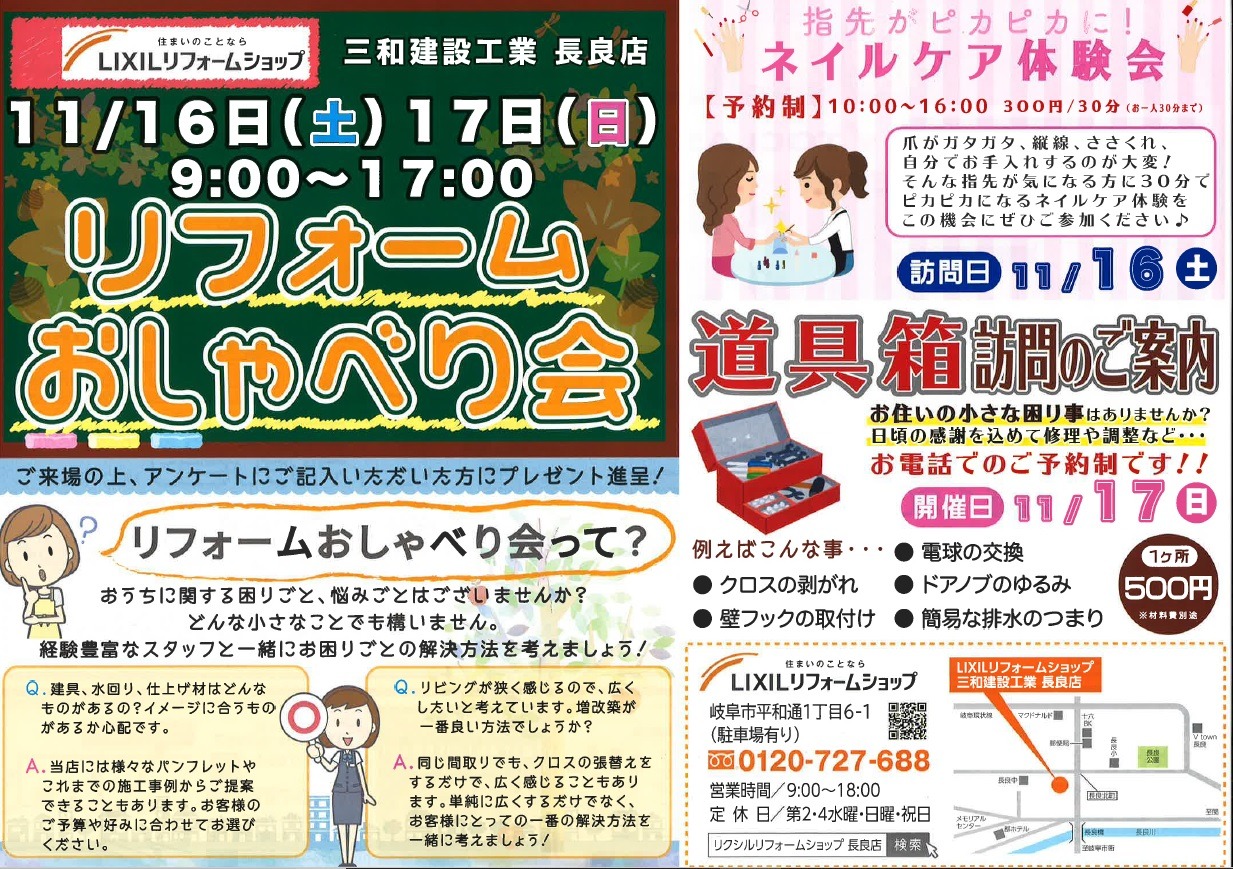 【長良店】11月の折込チラシ 11/16.17おしゃべり会!