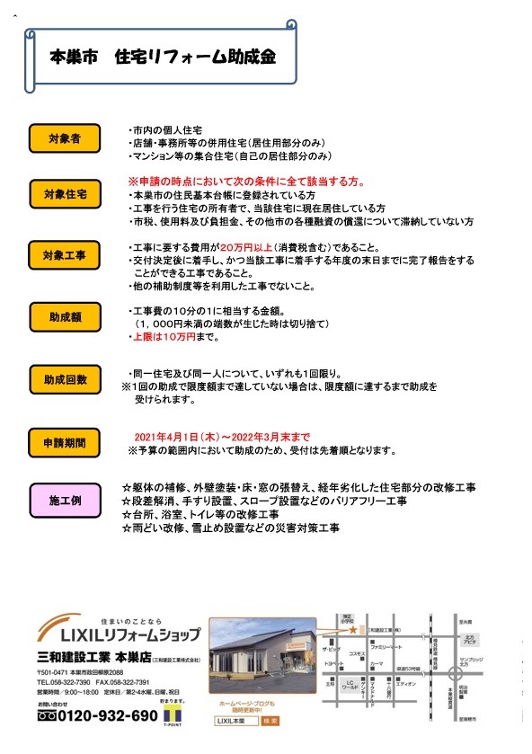 本巣市民の皆様、必見です!今年度も『本巣市住宅リフォーム助成金』が始まりました!本巣市でリフォームをご検討中の方は、最大10万円の助成金が受けられますので、是非ご活用ください。昨年度は早期に予算が終了となり、年度末を待たずに受付終了となりましたのでご相談はお早めに!助成金の申請書類作成・申請手続きは全て弊社にて行いますので、安心してお任せください!詳細は本巣店までお問い合わせください。お待ちしてお…